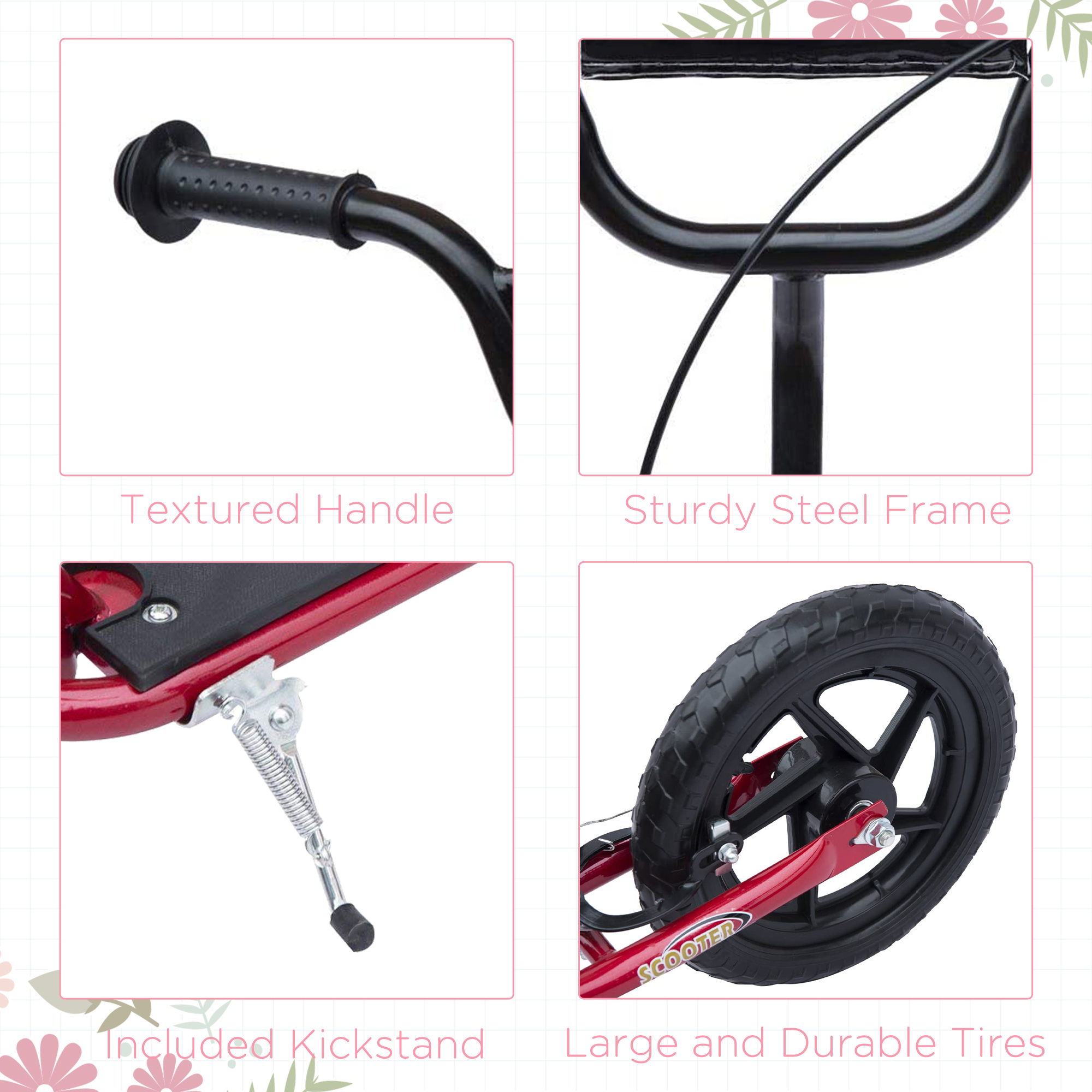 An outdoor classic, this kids scooter delivers fun and excitement with every ride. Suitable for ages 5-12, the adjustable handlebars grow with your child for long-term use. Its solid steel frame, wide non-slip foot deck and responsive rear brake keep rides safe and steady. With smooth-rolling 12" wheels, it's great for school runs, park adventures or just cruising the street – wherever they go, the fun follows.